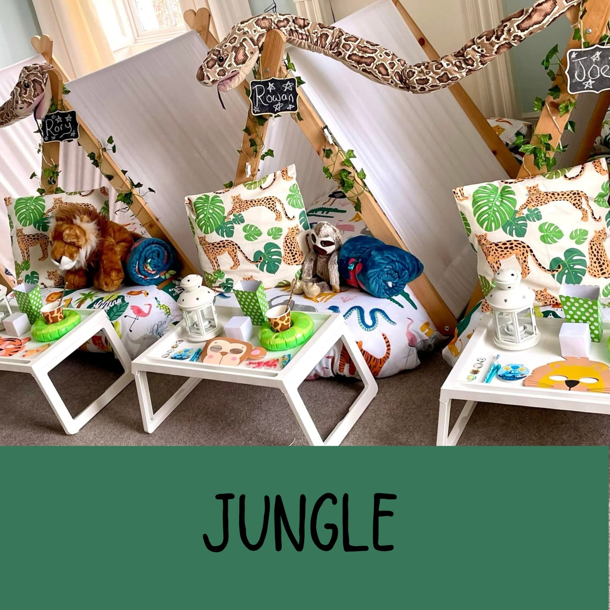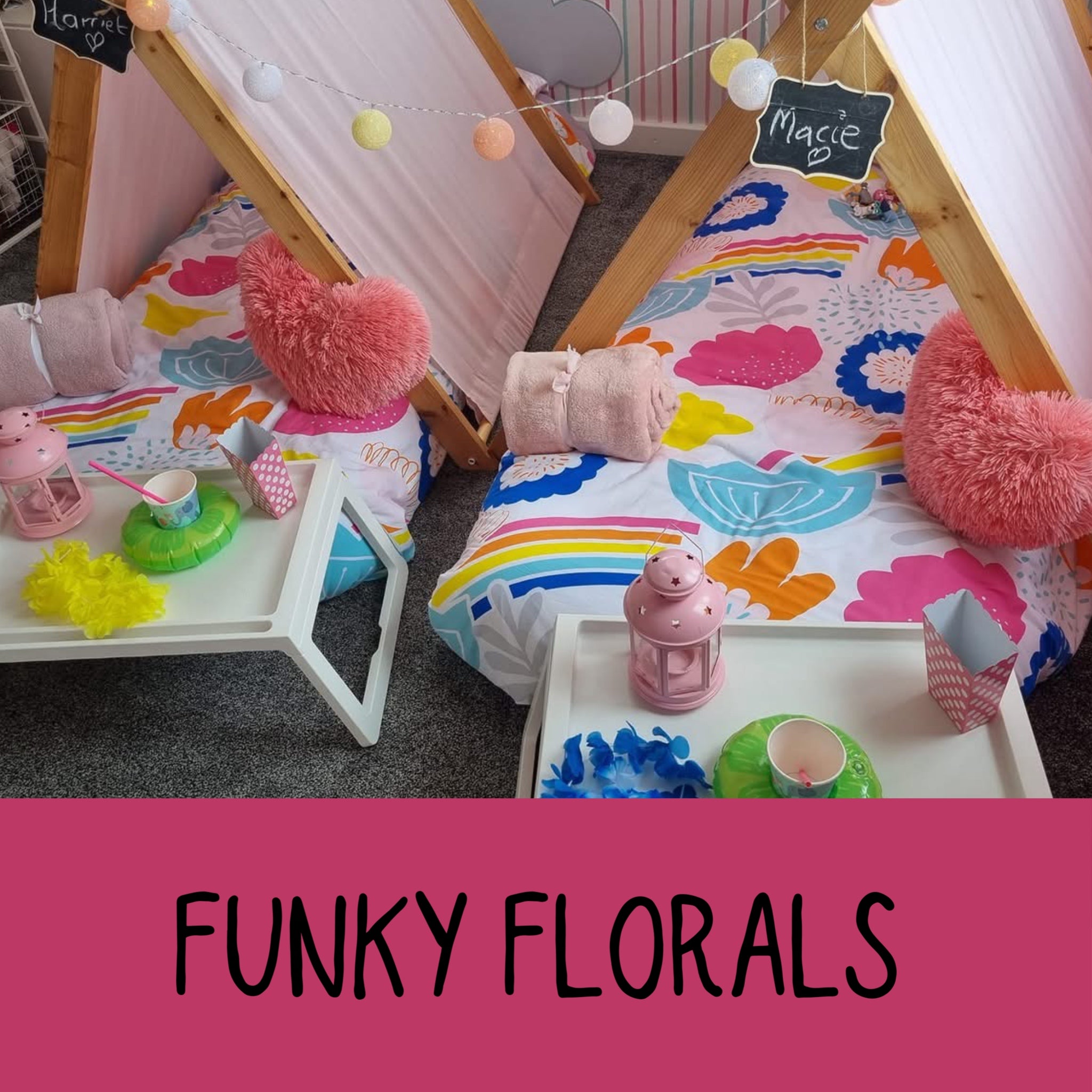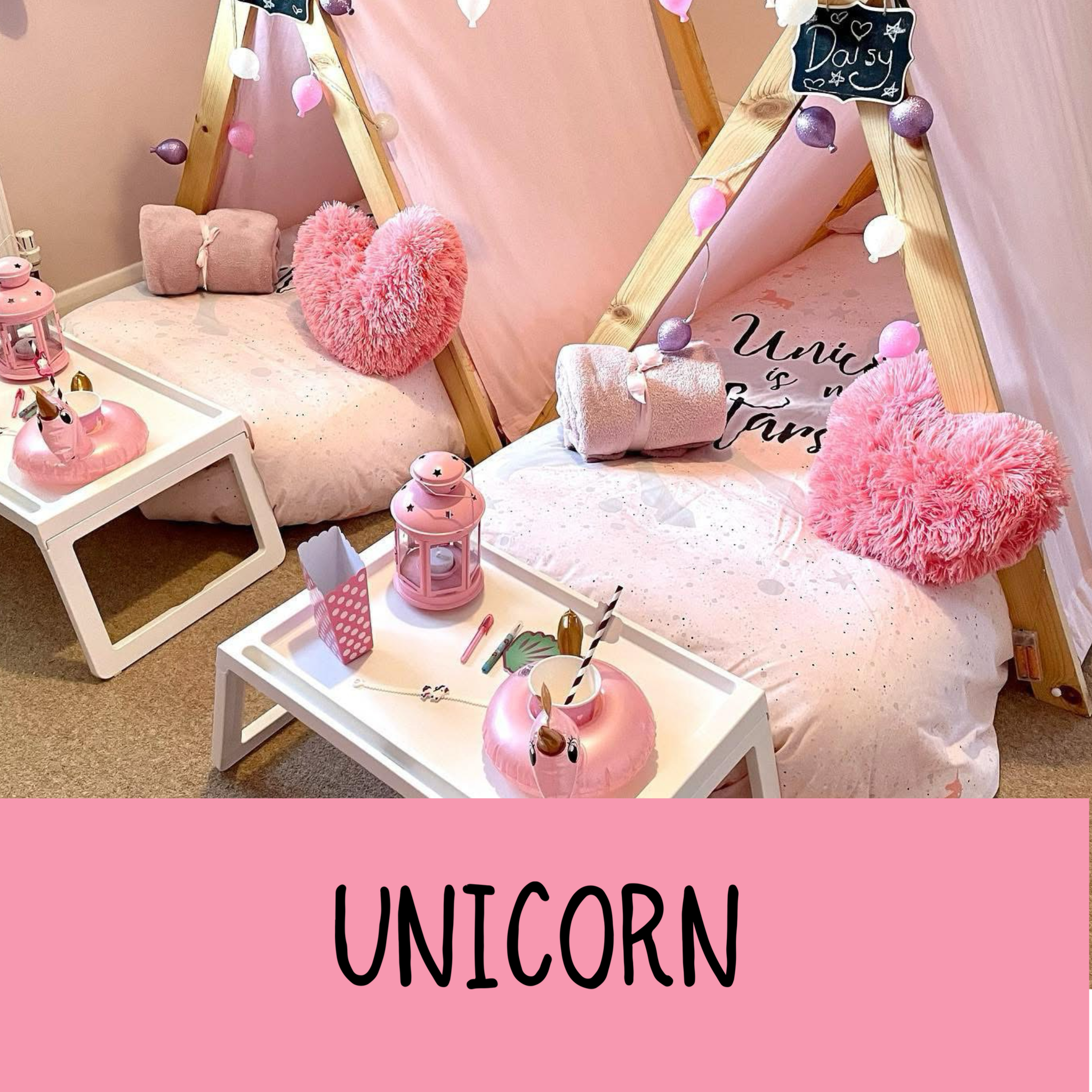 We have a wonderful selection of themes for you to choose from. Our luxury setups include everything you see- teepees, trays, lights, bedding, mattresses and lots of accessories to suit your theme.
